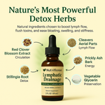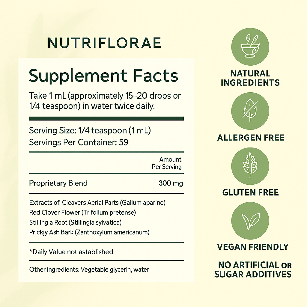 Nutriflorae Lymphatic Drainage Drops are crafted with gentle, plant-based ingredients to support lymph flow, reduce swelling, and promote daily detox: